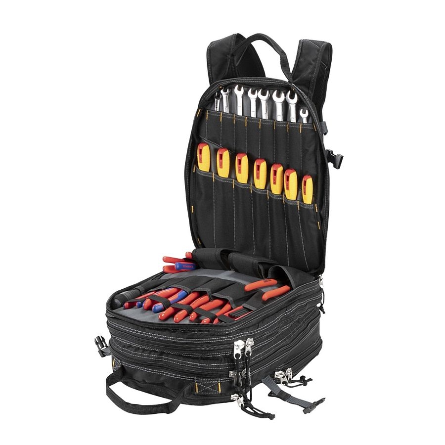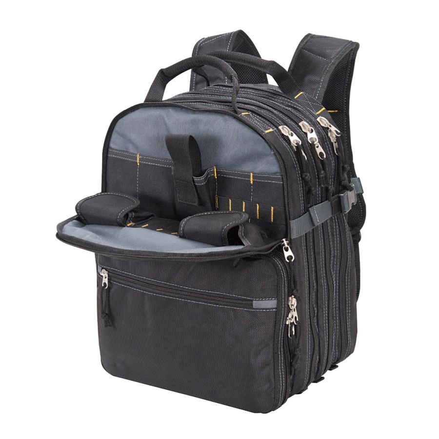 Unser hochwertiger Werkzeugrucksack besteht aus strapazierfähigem ballistischem Polyestergewebe mit langlebigen Reißverschlüssen und weichen, gepolsterten Tragegurten. Er ist mit einem Kunststoff-Sortimentskasten und 75 Einstecktaschen und -fächern für ein breites Spektrum an Hand- und Elektrowerkzeugen ausgestattet, z. B.: 14-teiliger Schraubenschlüsselsatz, Elektrobohrer, Bohrbits, Zangen, Schraubendreher, Prüfer usw.