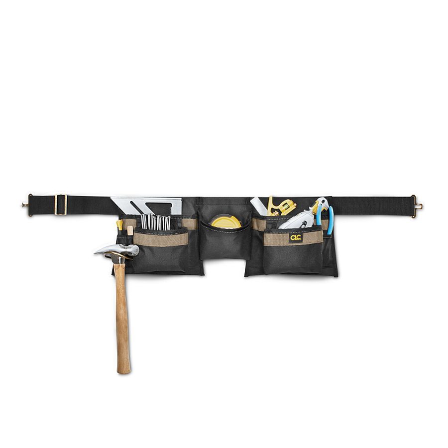 Diese Werkzeugschürze CL1001370 für Profis hat einen 50 mm breiten Gürtel mit Steckverschluss sowie 5 Haupttaschen, 3 kleinere Einstecktaschen und Einsteckfächer sowie eine Hammerschlaufe aus Stahl.