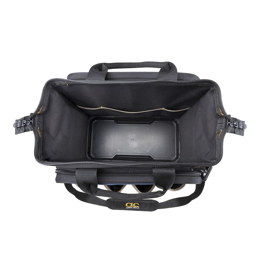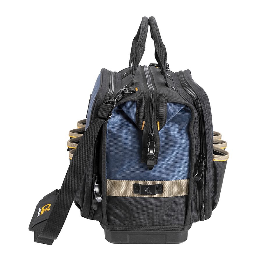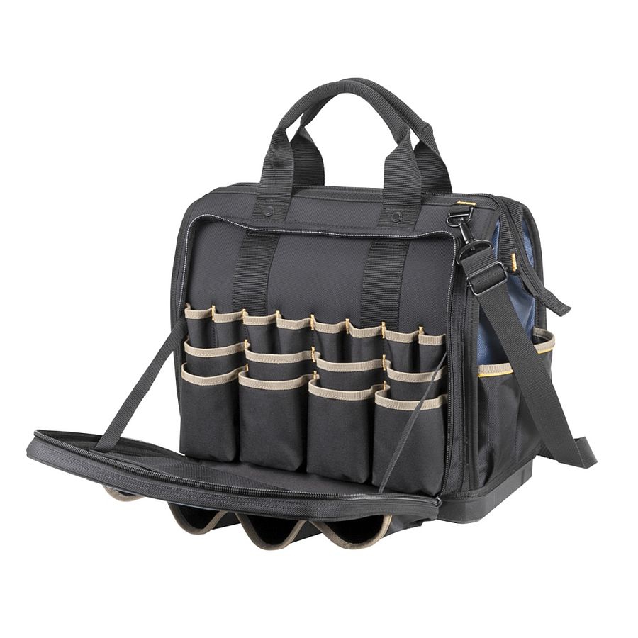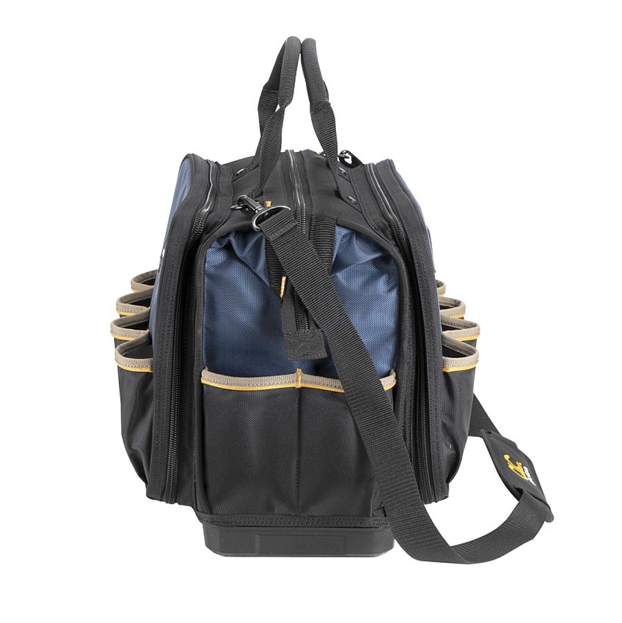 Die Werkzeugtasche für Techniker CL1PB1543 mit verstärktem Boden bietet 54 Werkzeugfächer mit senkrechter Anordnung. Zwei Reißverschlussfächer lassen sich für einfachen Zugriff herunterklappen. Das große Mittelfach bietet Platz für Elektrowerkzeug, Handwerkzeug und Zubehör. Bei der aus robustem ballistischem 1680D-Polyestergewebe gefertigten Tasche sorgt der verstärkte Boden für Langlebigkeit, festen Stand und einfachen Zugriff auf das Werkzeug.