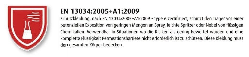 - IEC 61482-2:2009 Klasse 1 | EN ISO 11612:2008 A1;B1;C1;D0;E1;F0 | EN ISO 11611:2007 A1+A2 Klasse 1 | EN 1149-5:2008 | EN 13034:2005+A1:2009 Typ 6 | Zertifiziert EN ISO 20471:2013 - Klasse 2