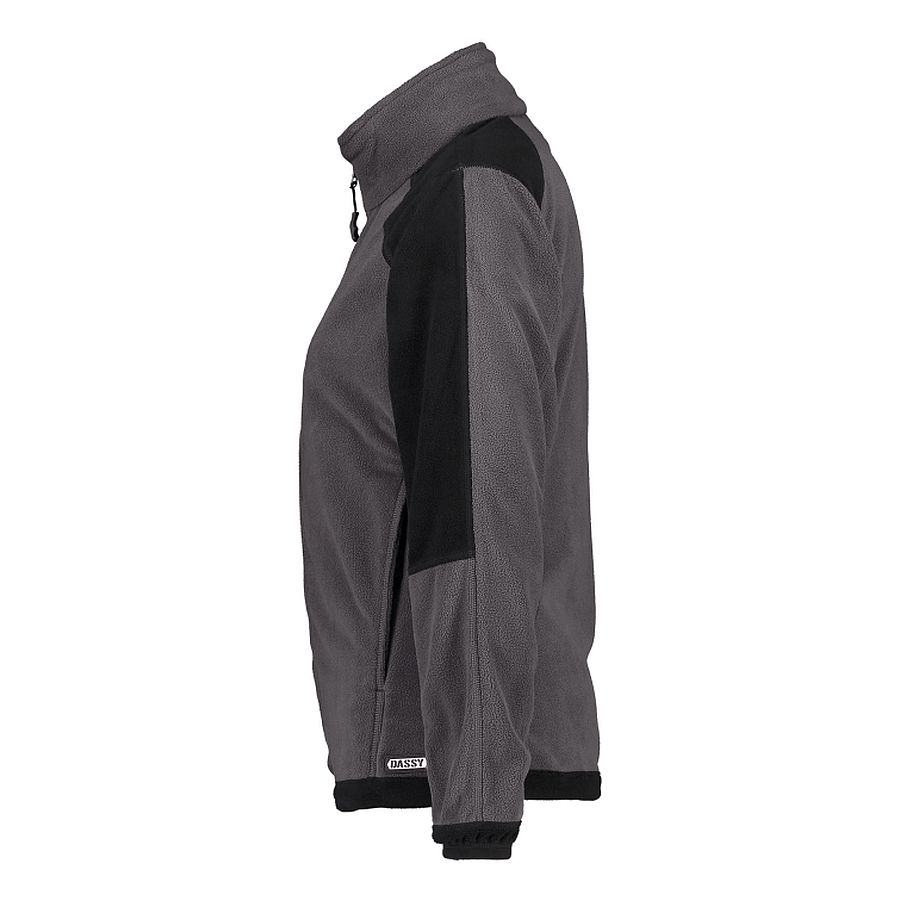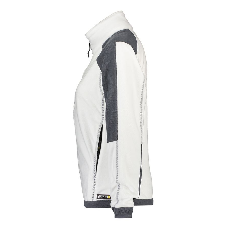 Moderne zweifarbige Damen Fleecejacke von DASSY Workwear. Der spezielle Damenschnitt sorgt für eine feminine Passform und verspricht in jeder Position maximalen Arbeitskomfort.