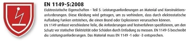 - IEC 61482-2:2009 Klasse 1 | EN ISO 11612:2008 A1;A2;B1;C1;D0;E1;F0 | EN ISO 11611:2007 A1+A2 Klasse 1 | EN 1149-5:2008 | EN 13034:2005+A1:2009 Typ 6