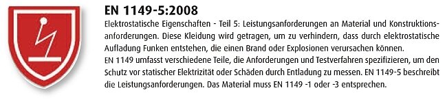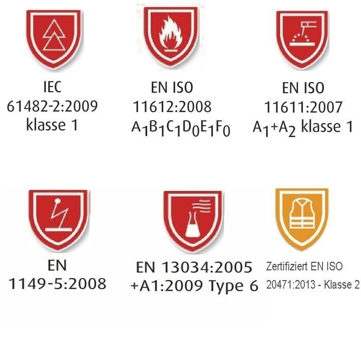 - IEC 61482-2:2009 Klasse 1 | EN ISO 11612:2008 A1;B1;C1;D0;E1;F0 | EN ISO 11611:2007 A1+A2 Klasse 1 | EN 1149-5:2008 | EN 13034:2005+A1:2009 Typ 6 | Zertifiziert EN ISO 20471:2013 - Klasse 2