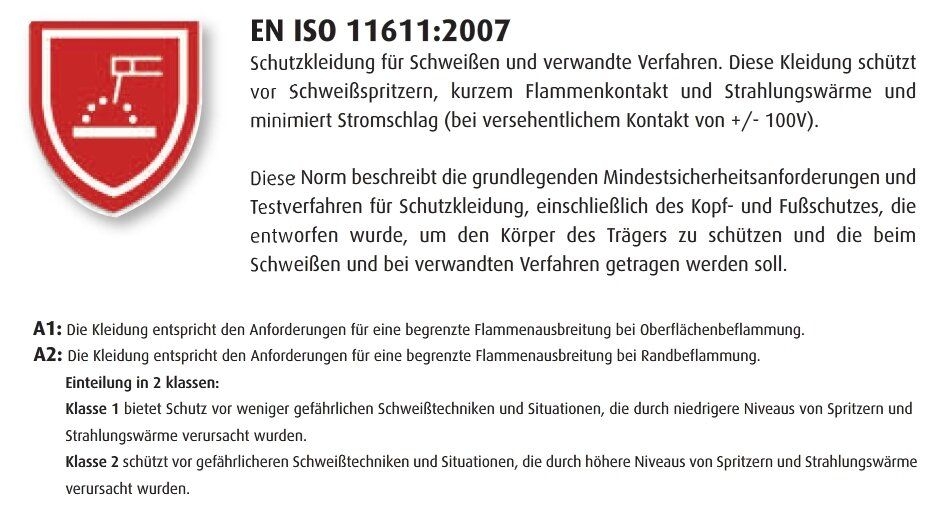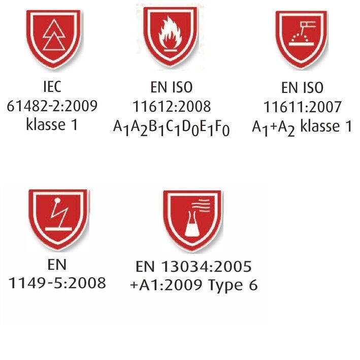 - IEC 61482-2:2009 Klasse 1 | EN ISO 11612:2008 A1;A2;B1;C1;D0;E1;F0 | EN ISO 11611:2007 A1+A2 Klasse 1 | EN 1149-5:2008 | EN 13034:2005+A1:2009 Typ 6