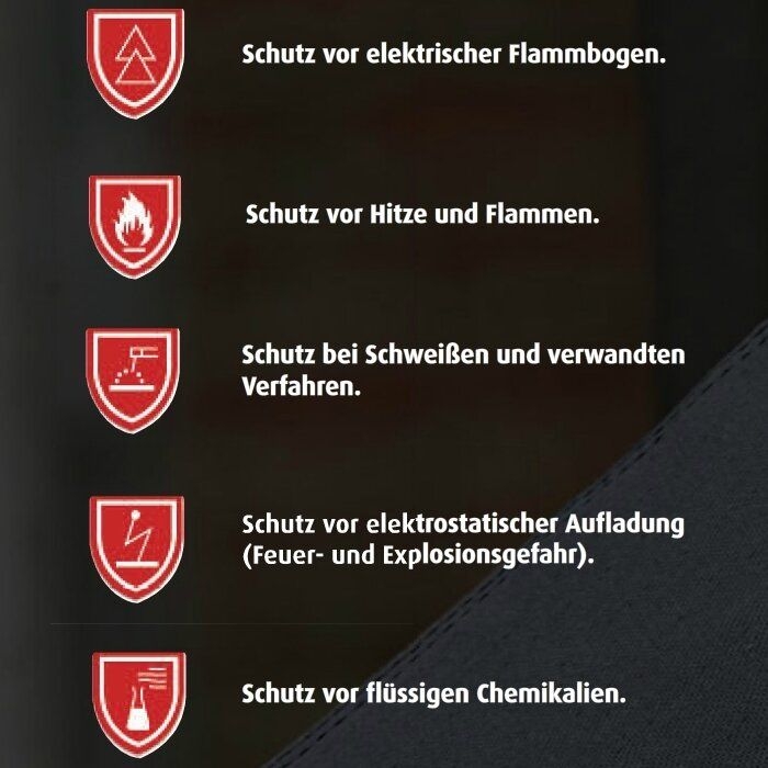 | Zertifizierung: | Chemikalienschutz EN 13034, Elektrostatischer Aufladung EN1149, Hitze/Flammschutz EN11612, Knieschutz EN14404, Lichtbogen EN 61482, Schweisserschutz EN ISO 11611 |