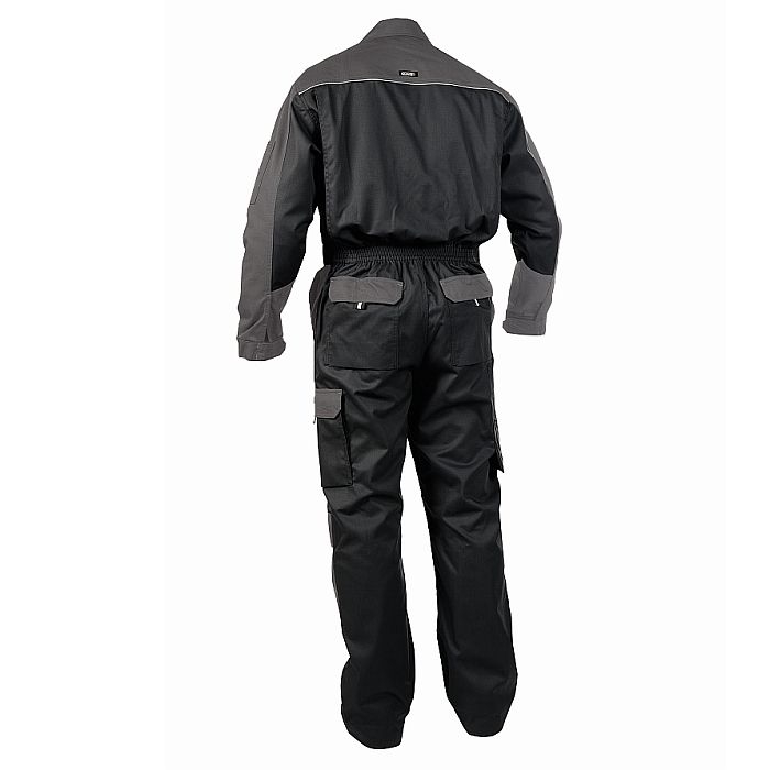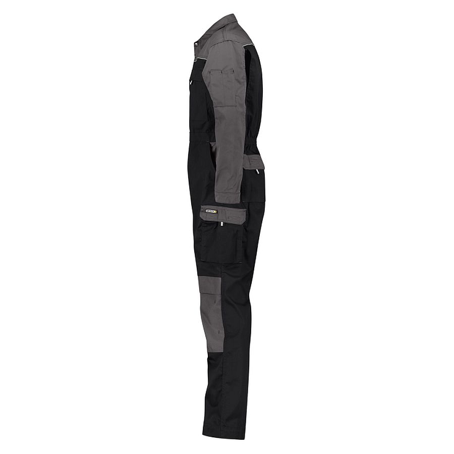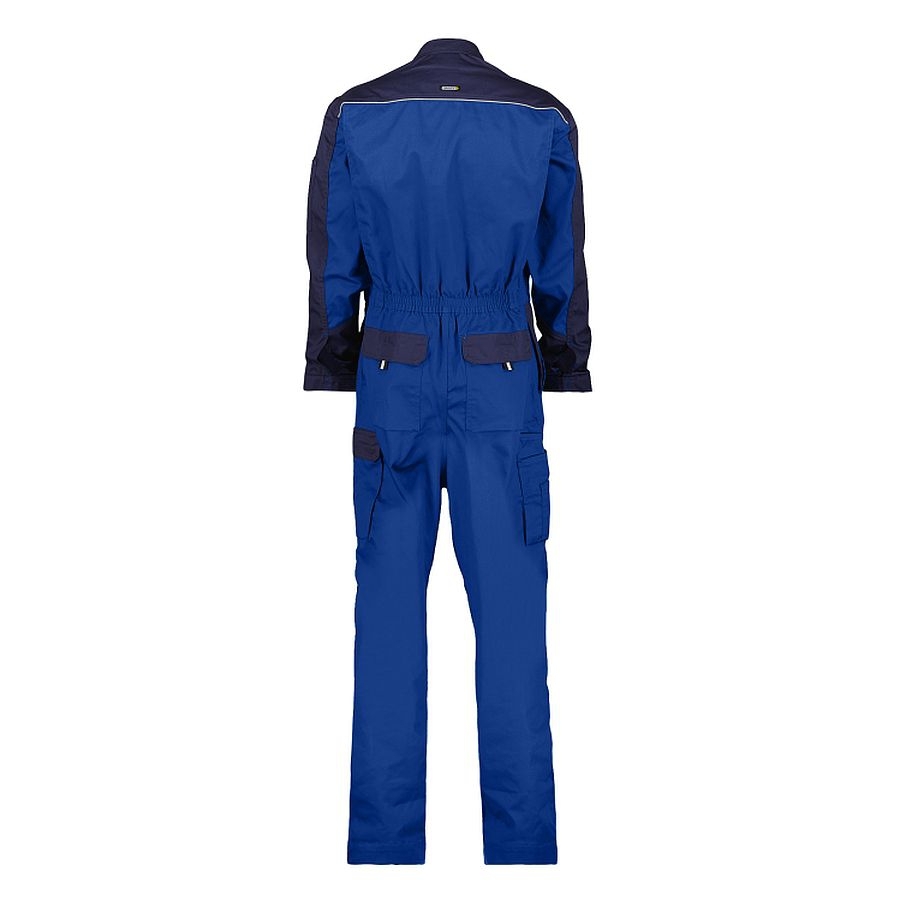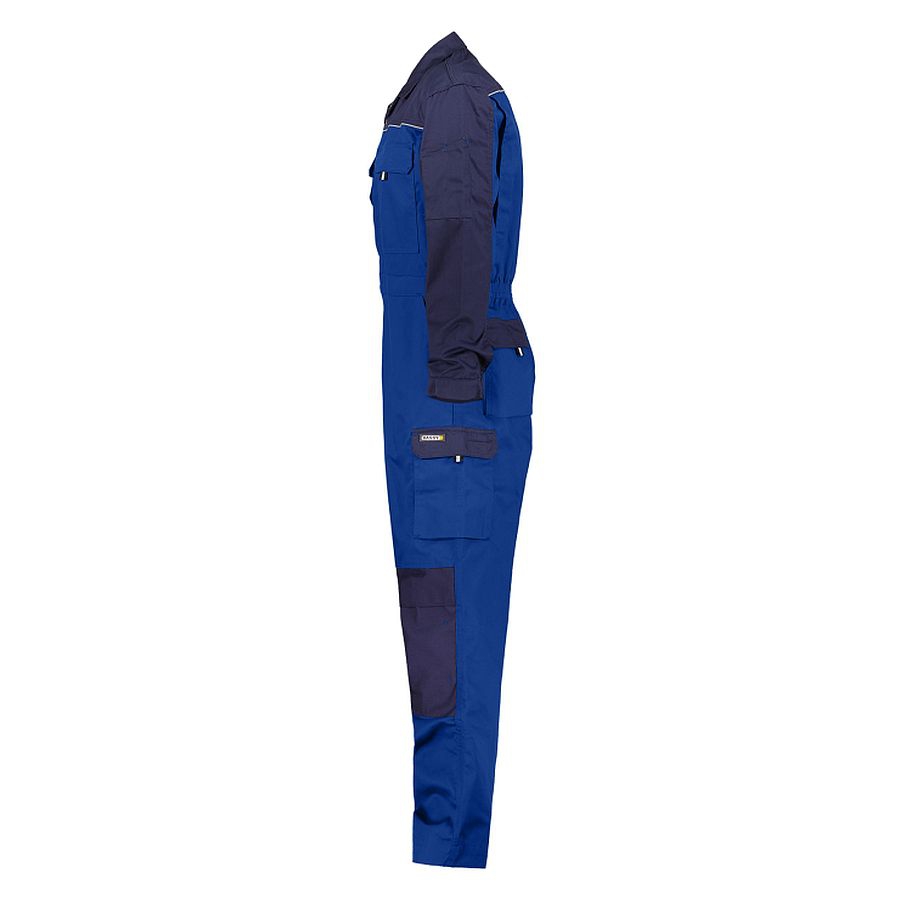Zweifarbiger Overall von DASSY Workwear aus strapazierfähigem Mischgewebe. Ausgestattet mit Kniepolstertaschen aus Cordura®, Zollstocktasche, Cargotasche und Gesäßtaschen. 3-fache Kappnähte sorgen für lange Haltbarkeit.