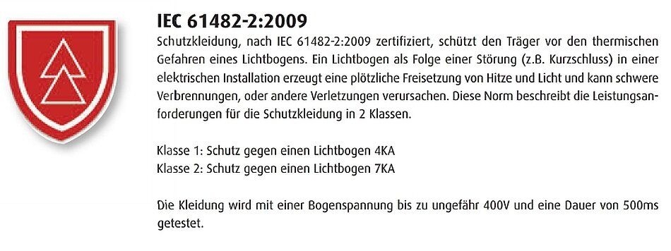 - IEC 61482-2:2009 Klasse 1 | EN ISO 11612:2008 A1;B1;C1;D0;E1;F0 | EN ISO 11611:2007 A1+A2 Klasse 1 | EN 1149-5:2008 | EN 13034:2005+A1:2009 Typ 6 | Zertifiziert EN ISO 20471:2013 - Klasse 2