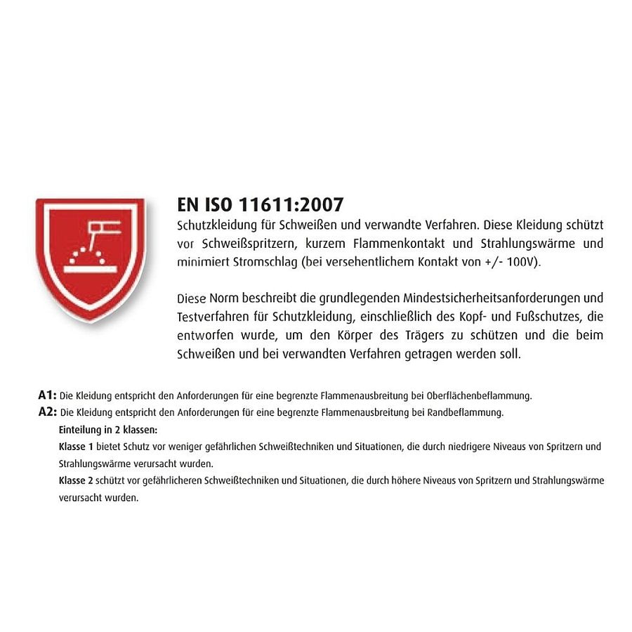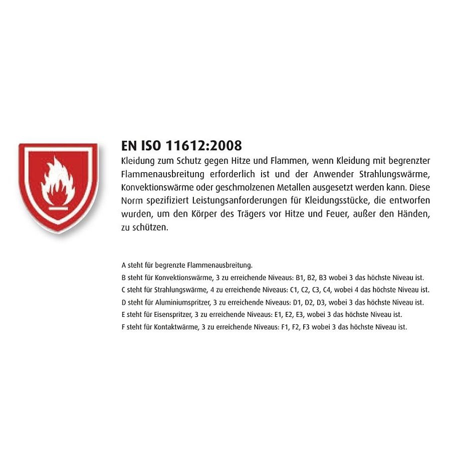 - EN ISO 11612:2008 A1;A2;B1;C1;D0;E1;F1 | EN ISO 11611:2007 A1+A2 Klasse 1