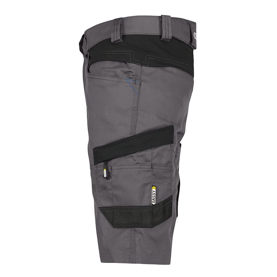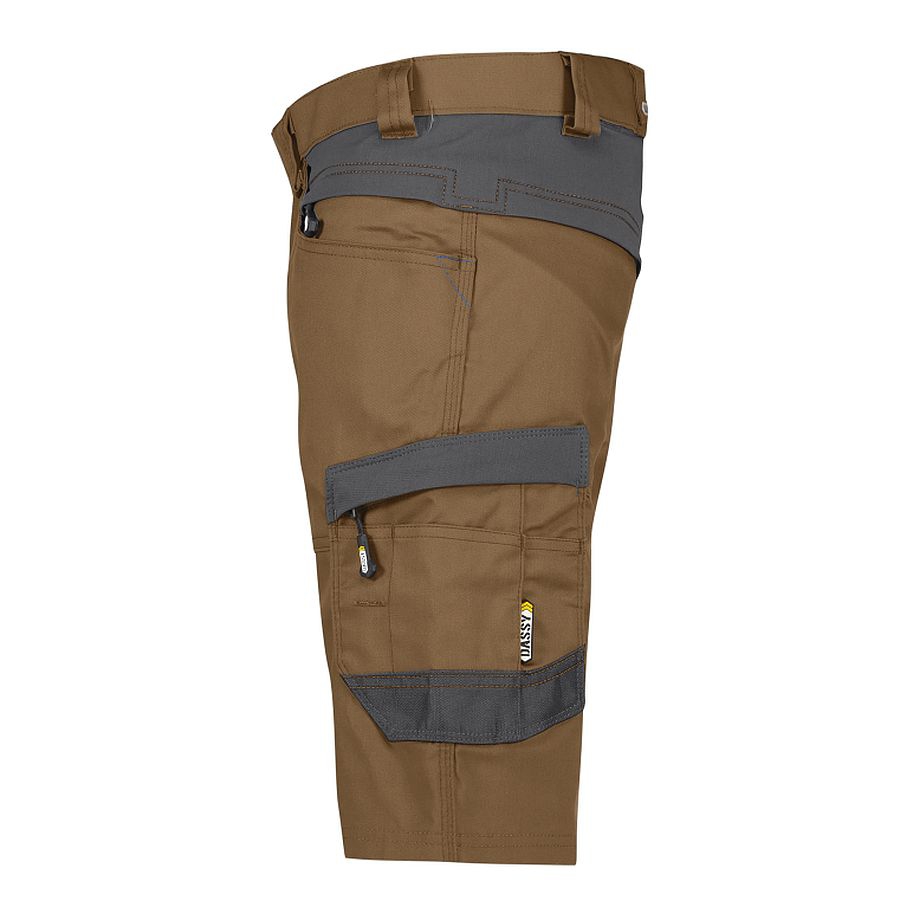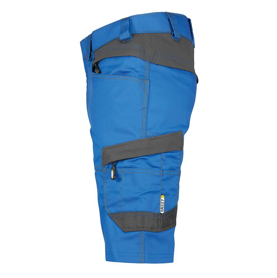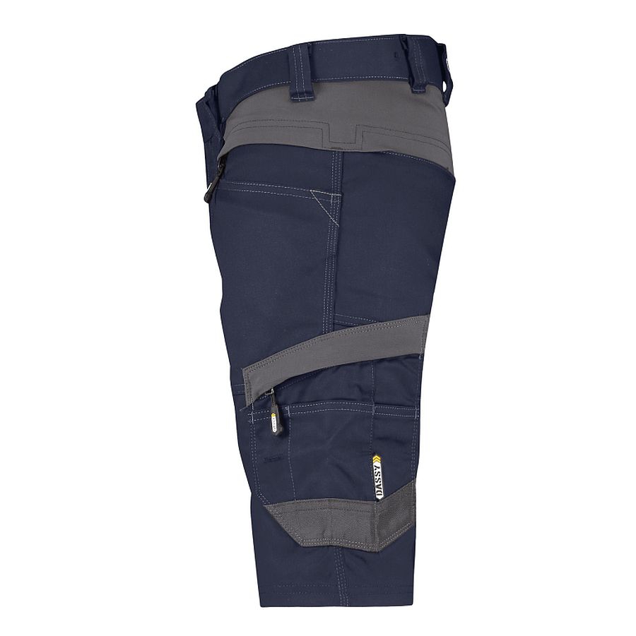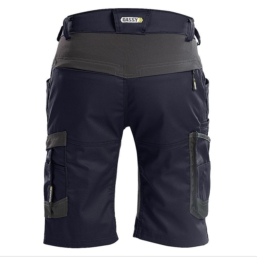 Die DASSY® Axis Stretch-Arbeitsshorts sind ein unverzichtbares Kleidungsstück für Profis in Handwerk, Industrie und Bauwesen, besonders an warmen Arbeitstagen. Gefertigt aus einer widerstandsfähigen Mischung aus 65% Polyester und 35% Baumwolle, gewährleisten diese Shorts mit einem Gewicht von etwa 245 g/m² Langlebigkeit und Komfort. Die besonderen Stretch-Einsätze aus 88% Polyamid und 12% Elasthan sorgen für außergewöhnliche Flexibilität und Bewegungsfreiheit, insbesondere im Schritt und am Bund. Hinsichtlich der Funktionalität bieten die Shorts umfangreichen Stauraum mit zwei Schubtaschen, sowohl offenen als auch verschließbaren Gesäßtaschen, zwei Schenkeltaschen sowie speziellen Stifte- und Zollstocktaschen und einer Cuttertasche. Der tiefer geschnittene Bund und die verstellbare Rückenelastik tragen zu einer ergonomischen Passform und zusätzlichem Komfort bei. Die Qualität und Sicherheit dieser Arbeitsshorts sind durch die OEKO-TEX® Standard 100 Zertifizierung gesichert, und die verstärkten Nylon Cordura®-Bereiche erhöhen ihre Haltbarkeit. Die Pflege dieser Arbeitsshorts ist unkompliziert, da sie bei bis zu 60°C gewaschen werden können, allerdings sind Bleichen, chemische Reinigung und Bügeln bei hohen Temperaturen zu vermeiden.