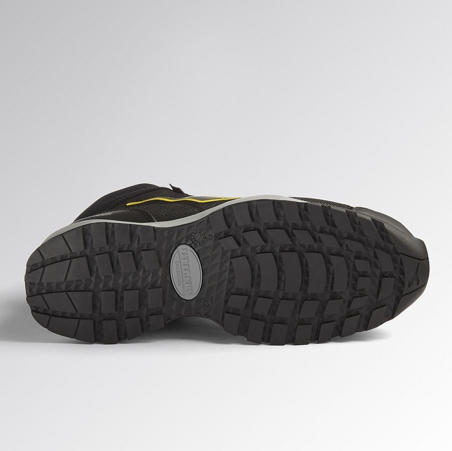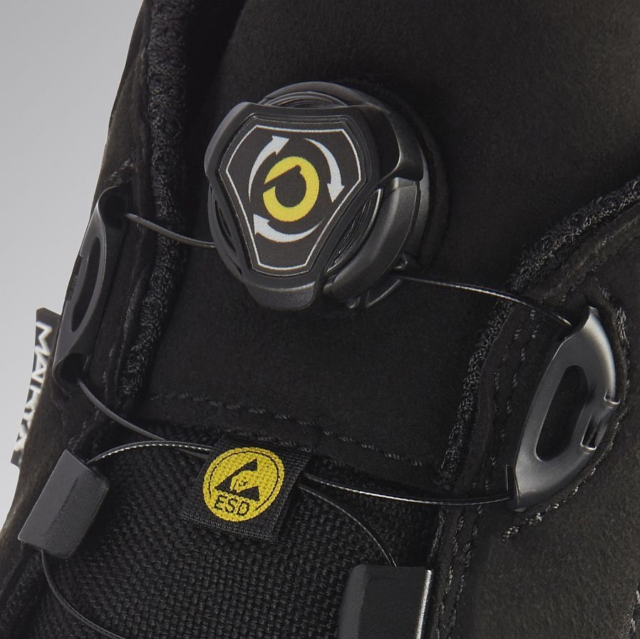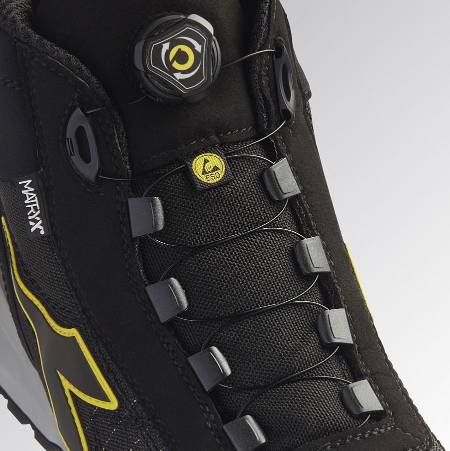 Mittelhoher Sicherheitsschuh S3 aus atmungsaktivem, abriebfestem und wasserabweisendem technischem Mehrfasergewebe Matryx. Schnellschnürsystem Quick von Diadora. Mass Damper Dämpfungstechnologie, Zehenkappe aus Aluminium 200J. Passform 11. Futter aus Air Mesh mit rutschfester Mikrofaser, K SOLE, Film aus TPU. Herausnehmbare anatomische Einlegesohle aus PU-Schaum und Aktivkohle. TPU Fersen- und Zehenschutz. ESD.