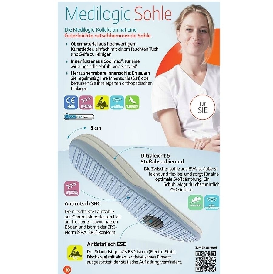 Das Modell Carinne ist ein sportlicher Clog mit einer SRC zertifizierten rutschhemmenden Sohle. Der verstellbare Riemen hinterher gewährleistet eine optimale Unterstützung Ihres Fußes. Perfekt fürs Pflegepersonal oder für jedermann, der einen bequemen Berufsschuh sucht.