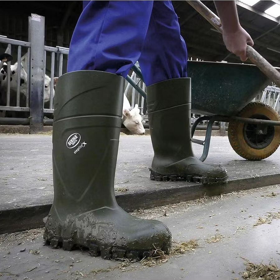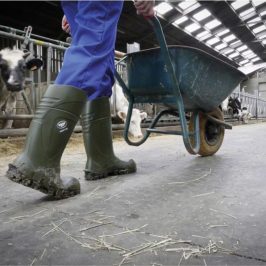 Warum dieser Stiefel auf dem Hof punktet: Im Melkstand und in der Futterküche sorgt die SRC-Rutschhemmung für sicheren Tritt auf nassen Fliesen und Gummimatten. Auf dem Hof widersteht die FO-Sohle Diesel, Ölen und Fetten, wie sie an Werkbank, Schlepper und Hoflader vorkommen. Auf dem Feld halten die WRU-Eigenschaften Matsch und Pfützen zuverlässig draußen. Und wenn’s in den Morgenstunden zieht oder im Kühlraum kalt ist, hilft die Kälteisolierung (CI), die Fußtemperatur angenehm zu halten. Kurzum: Der Bekina STEPLITEX SOLIDGRIP XAN4P (Artikelnummer XAN4P) bietet Ihnen durchdachte Sicherheit und Komfort – Tag für Tag in der Landwirtschaft.