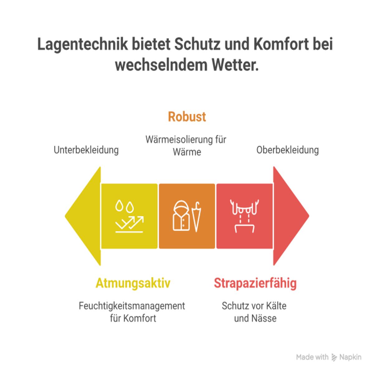 - Oberbekleidung: Der äußere Schutz gegen die Wetterelemente. Diese Schicht sollte wind- und wasserdicht sein, um dich vor Regen und starkem Wind zu schützen.
