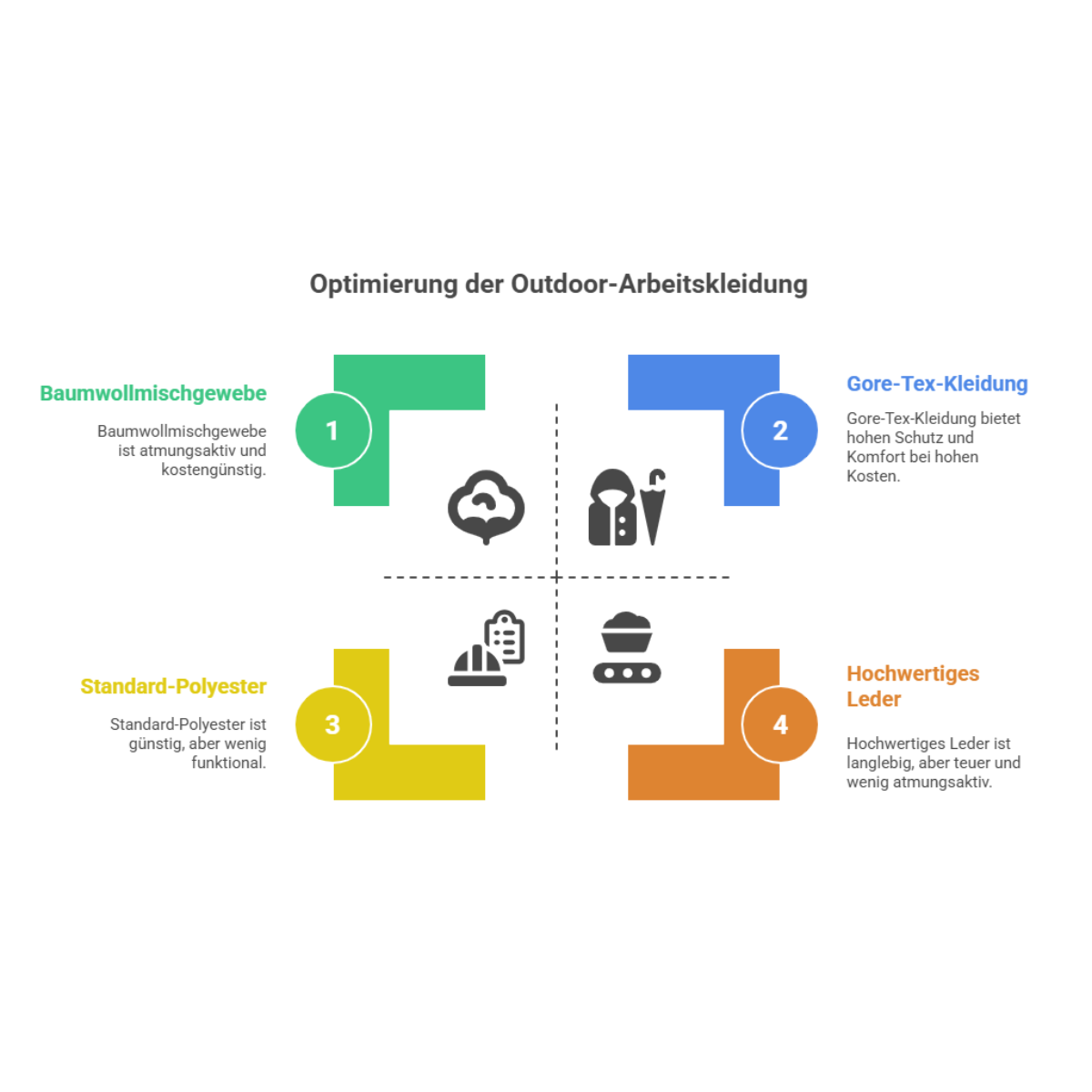 Deine Arbeitskleidung muss einiges aushalten. Robuste, atmungsaktive Stoffe sind das A und O. Materialien wie Gore-Tex oder Baumwollmischgewebe bieten hervorragenden Schutz vor Wind und Wetter, ohne die Atmungsaktivität zu beeinträchtigen. Diese Materialien kombinieren Langlebigkeit mit hohem Tragekomfort – genau das, was du in deinem anspruchsvollen Arbeitsalltag brauchst.