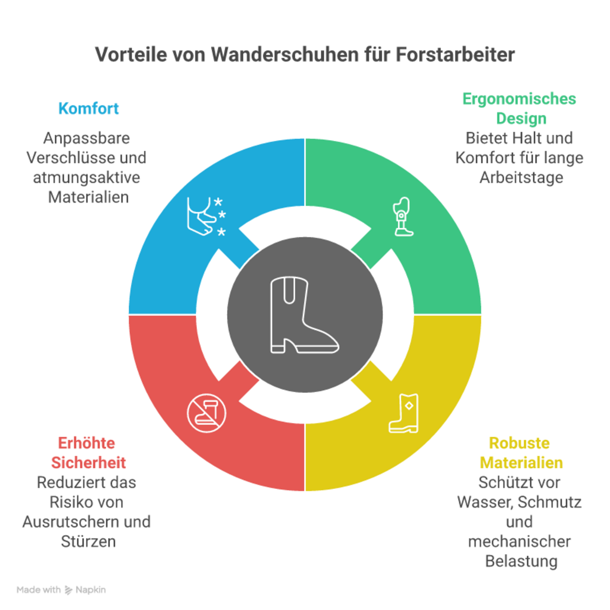 Wanderschuhe sind speziell darauf ausgelegt, den Herausforderungen des Forstbodens zu begegnen. Mit ihrem ergonomischen Design bieten sie optimalen Halt und maximale Stabilität. Dies ist besonders wichtig auf unebenen und rutschigen Wegen, die in vielen Arbeitsbereichen die Regel sind. Die Sohlen sind oft mit einer speziellen Profilierung ausgestattet, die das Risiko, auszurutschen, erheblich vermindert.