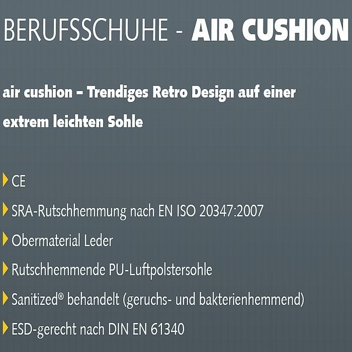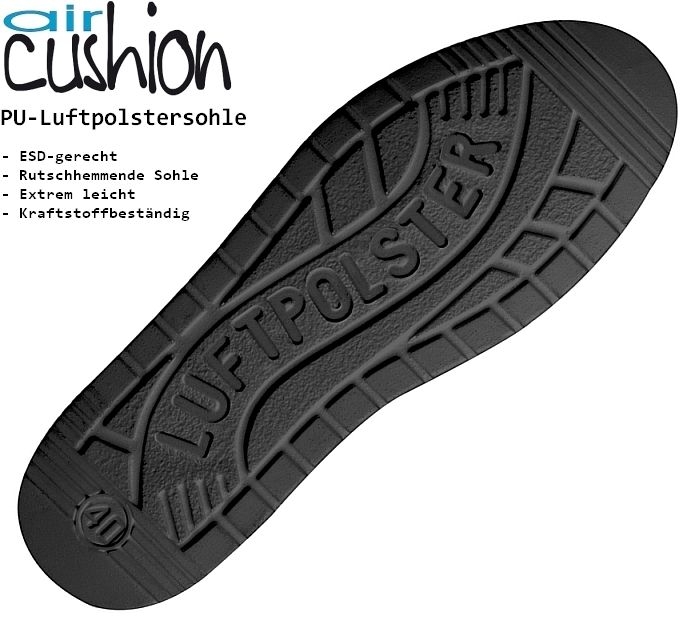Der leichte Abeba ESD Berufsschuh mit der innovativen Luftpolstersohle aus der Serie AIR CUSHION. Die Luftpolstersohle aus dauerelastischem Weichschaum gewährleistet einen hervorragenden Tragekomfort und bietet maximale Sicherheit. Eine bequeme Paßform und anatomisch geformte Einlegesohlen bringen Ihre Füße stressfrei durch den Tag.