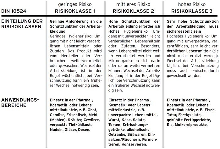 - Norm: Risikoklassen 1-3 nach DIN 10524:2004 (Farben dunkelgrau und mittelgrün Risikoklasse 1)