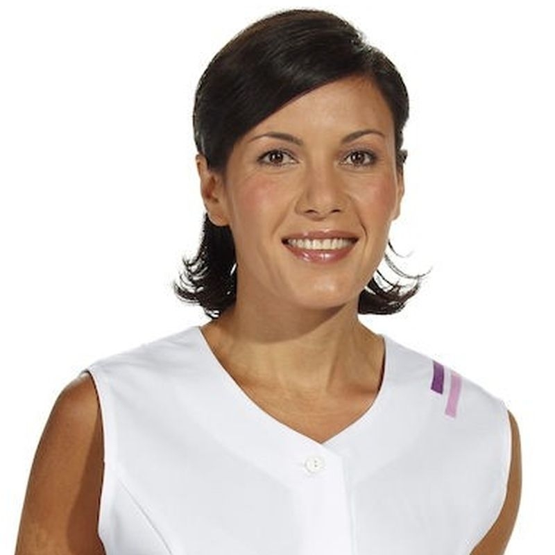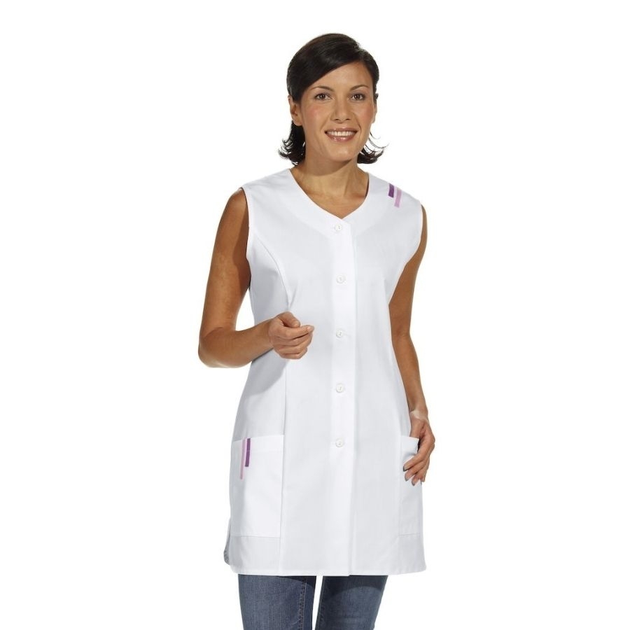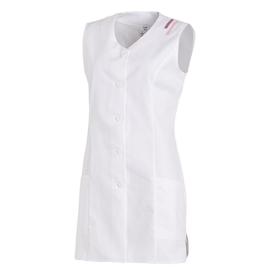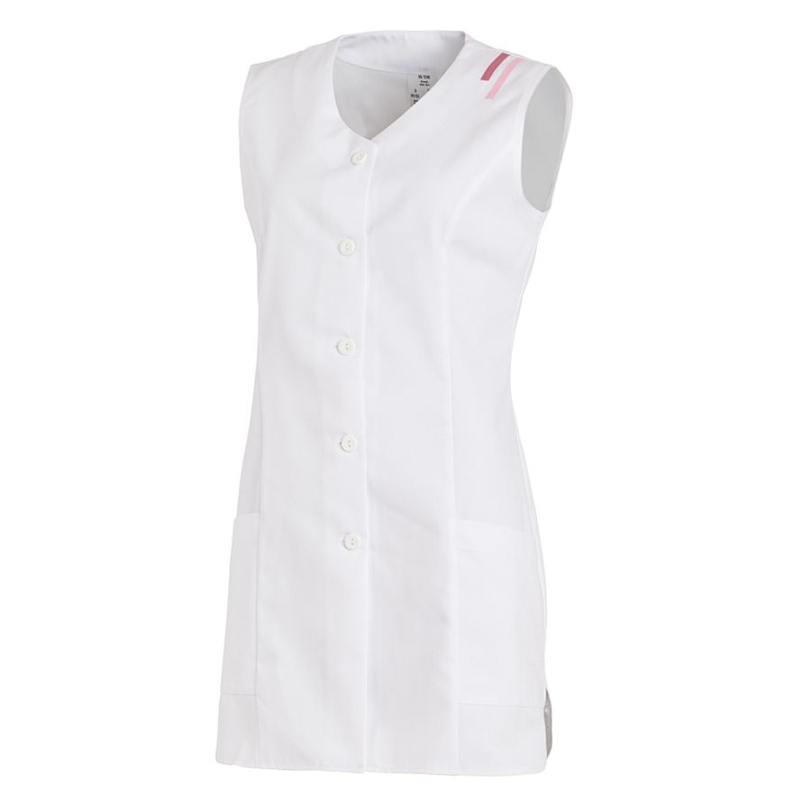 Ärmelloser Leiber 7/8 Damenkasack 09/1246 mit leicht geschwungenem V-Ausschnitt und farbigem Besatz an Schultern und Tasche. Dieser Damenkasack ist aus einem klassischen Mischgewebe gefertigt und ist somit robust, langlebig und für industrielle Waschverfahren geeignet.