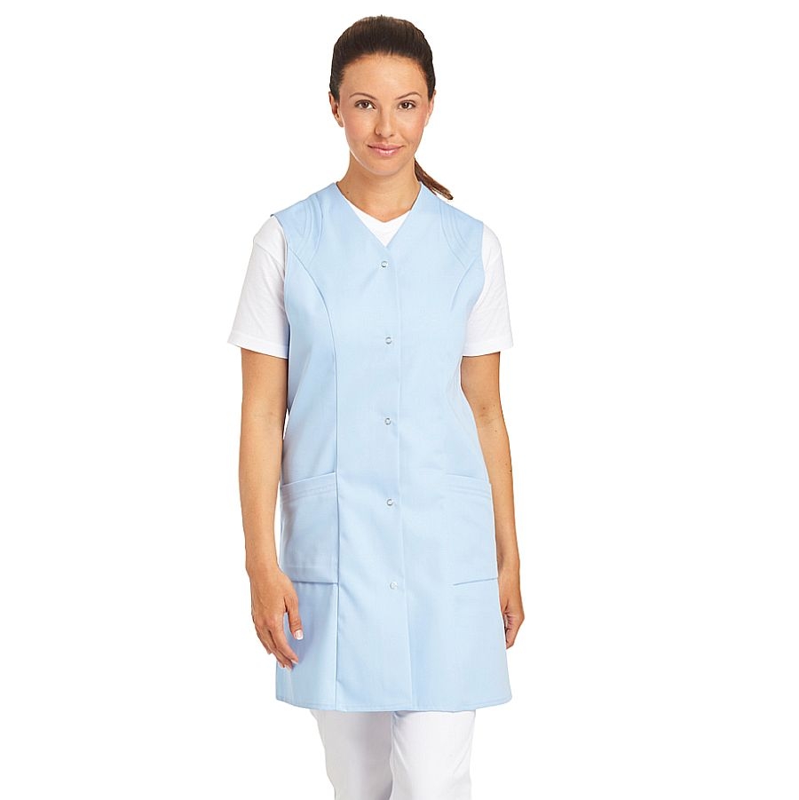 Ärmelloser Leiber 7/8 Damenkasack 09/390 mit leicht geschwungenem V-Ausschnitt und dezenten Designdruckknöpfen. Dieser Damenkasack ist aus einem klassischen Mischgewebe gefertigt und ist somit robust, langlebig und für industrielle Waschverfahren geeignet.