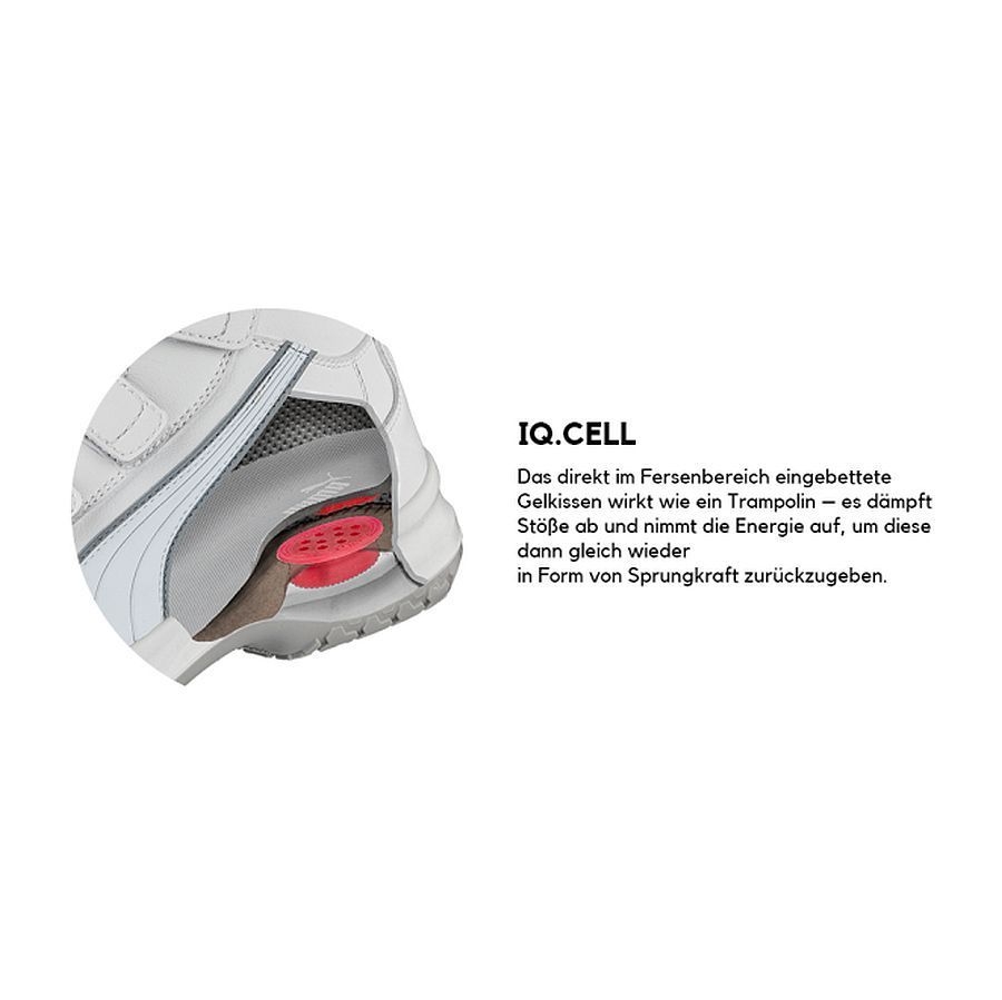 Das Besondere an der WHITE 'N SERVICE Linie von PUMA ist das IQ.CELL - ein direkt im Fersenbereich eingebettes Gelkissen, das wie ein Trampolin wirkt. Es dämpft Stöße ab, nimmt die Energie auf, um sie dann gleich wieder in Form von Sprungkraft zurückzugeben. Der ABSOLUTE LOW Sicherheitsschuh mit praktischem Klettverschluss ist ideal für den Einsatz in Küchen, Laboren oder sonstigen gefließten Arbeitsbereichen. Denn durch die spezielle Wabenstruktur des Antislip-Profils der abriebfesten, flexiblen und leichten Laufsohle wird stehende Flüssigkeit abgeleitet und so die Rutschfestigkeit optimiert.