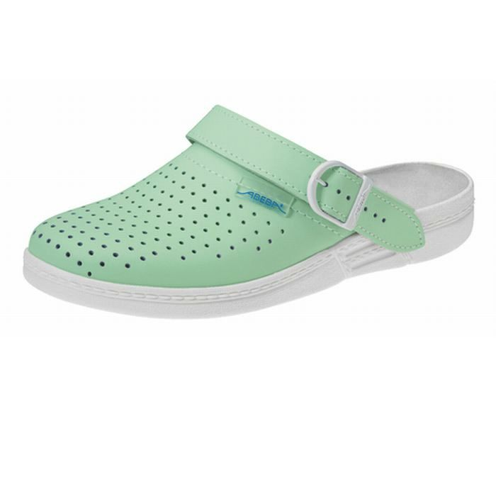 Leichter und bequemer Abeba Clog mit mintfarbenem, perforiertem Obermaterial. Die rutschemmende Sohle sorgt für einen sicheren Halt auch bei schwierigen Bodenverhältnissen.