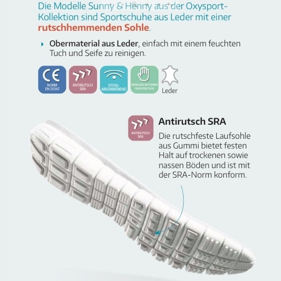 Das Modell SUNNY bietet Ihnen einen sportlichen Look mit Stil. Die zertifizierte rutschhemmende Sohle bietet mehr Sicherheit und die Verarbeiting in Leder und Nylon-Mesh gewährleisten einen langfristigen Komfort. Dieses Modell ist ideal für Krankenschwestern, aber erweist sich auch außerhalb des Krankenhauses als nützlich.