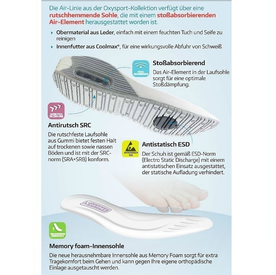 - Normen: CE-Norm: EN ISO 20347, Antistatisch: ESD-Norm, Antislip: SRC-Norm (SRA + SRB)